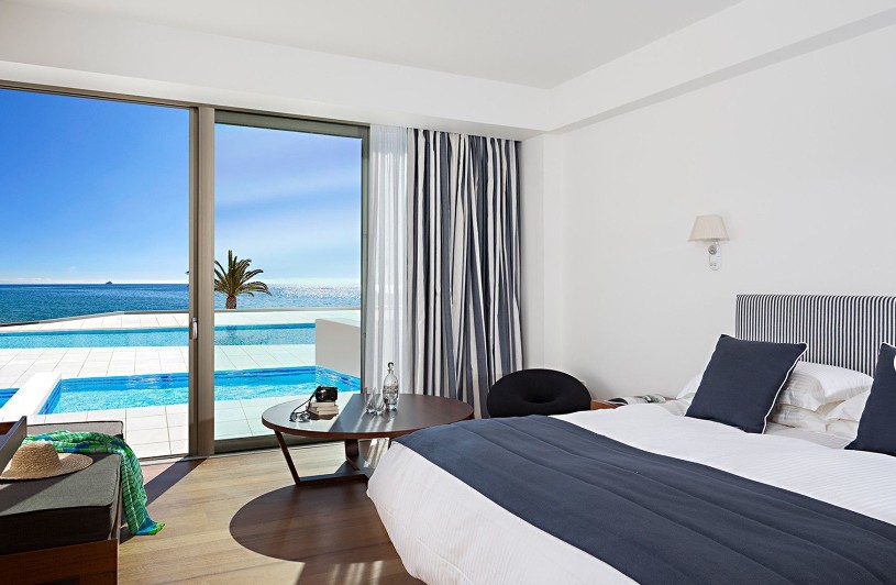 Τα ευρύχωρα δωμάτια του ξενοδοχείου συνδυάζουν λιτές γραμμές, μοντέρνα αισθητική και σύγχρονες ανέσεις. Μεγάλες βεράντες επεκτείνουν τον χώρο του δωματίου προς τα έξω με θέα προς τους προσεγμένους κήπους και στο βάθος τη θάλασσα. Όλα τα δωμάτια έχουν: μπάνια με μπανιέρα και ξεχωριστή ντουζιέρα, ,καναπέ και καθιστικό, σύστημα ύπνου Cocomat με πολυτελή αφράτα παπλώματα, κλιματισμό, τηλέφωνο, τηλεόραση υψηλής ευκρίνειας με δορυφορικά κανάλια, χρηματοθυρίδα ασφαλείας (μεγέθους laptop),στεγνωτήρα μαλλιών, μεγεθυντικό καθρέπτη, παντόφλες, δωρεάν WIFI.