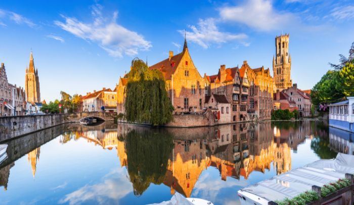 Πρωινό στο ξενοδοχείο. Σήμερα Θα περπατήσουμε στο ιστορικό κέντρο της παραμυθένιας πόλης-Μνημείο Παγκόσμιας κληρονομιάς της Ουνέσκο με πανέμορφους μικρούς-μεγάλους πυργίσκους , και πλακόστρωτα δρομάκια. θα επισκεφθούμε το ναό της Παναγίας με το καμπαναριό Μπέλφορ, έμβλημα της πόλης πουν έχει ύψος 122 μέτρα . Το Γλυπτό της Παναγίας της βρεφοκρατούσας που βρίσκεται στην εκκλησία είναι δημιούργημα του Μικελάντζελο. Στην όμορφη πλατεία Μπούργκ δεσπόζει το υπέροχο δημαρχείο γοτθικού τύπου. Στην εν λόγω πλευρά της πόλης, στη καθολική Βασιλική του Ιερού Αίματος υπάρχει η ξακουστή φιάλη του Ιερού Αίματος που περιέχει ένα πανί με το αίμα του Ιησού και υποστηρίζεται ότι χρησιμοποιήθηκε από τον Ιωσήφ της Αριμαθαίας μετά την αποκαθήλωση του Χριστού από τον Σταυρό του Μαρτυρίου. Η φιάλη ήρθε στην πόλη μετά τη Δεύτερη Σταυροφορία από τον Τιερί της Αλσατίας και περιφέρεται κάθε χρόνο στους δρόμους της πόλης. Θα δούμε επίσης το πάρκο με τη «Λίμνη της Αγάπης», το παλαιότερο νοσοκομείο στην Ευρώπη του Αγίου Ιωάννη, τη πολυφωτογραφημένη γέφυρα του Αγίου Βονιφάτιου, το Μέγαρο των Αρχόντων, τους κήπους Aρεντς και τέλος το Κολέγιο της Ευρώπης, το πρώτο χρηματιστήριο στον κόσμο, μοναδικό στολίδι της πόλης. Υπόλοιπο ημέρας ελεύθερο. Διανυκτέρευση.